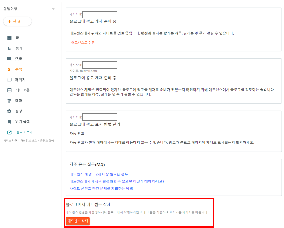 아래 블로그에서 애드센스를 삭제하시면 간단하게 해결할 수 있습니다.